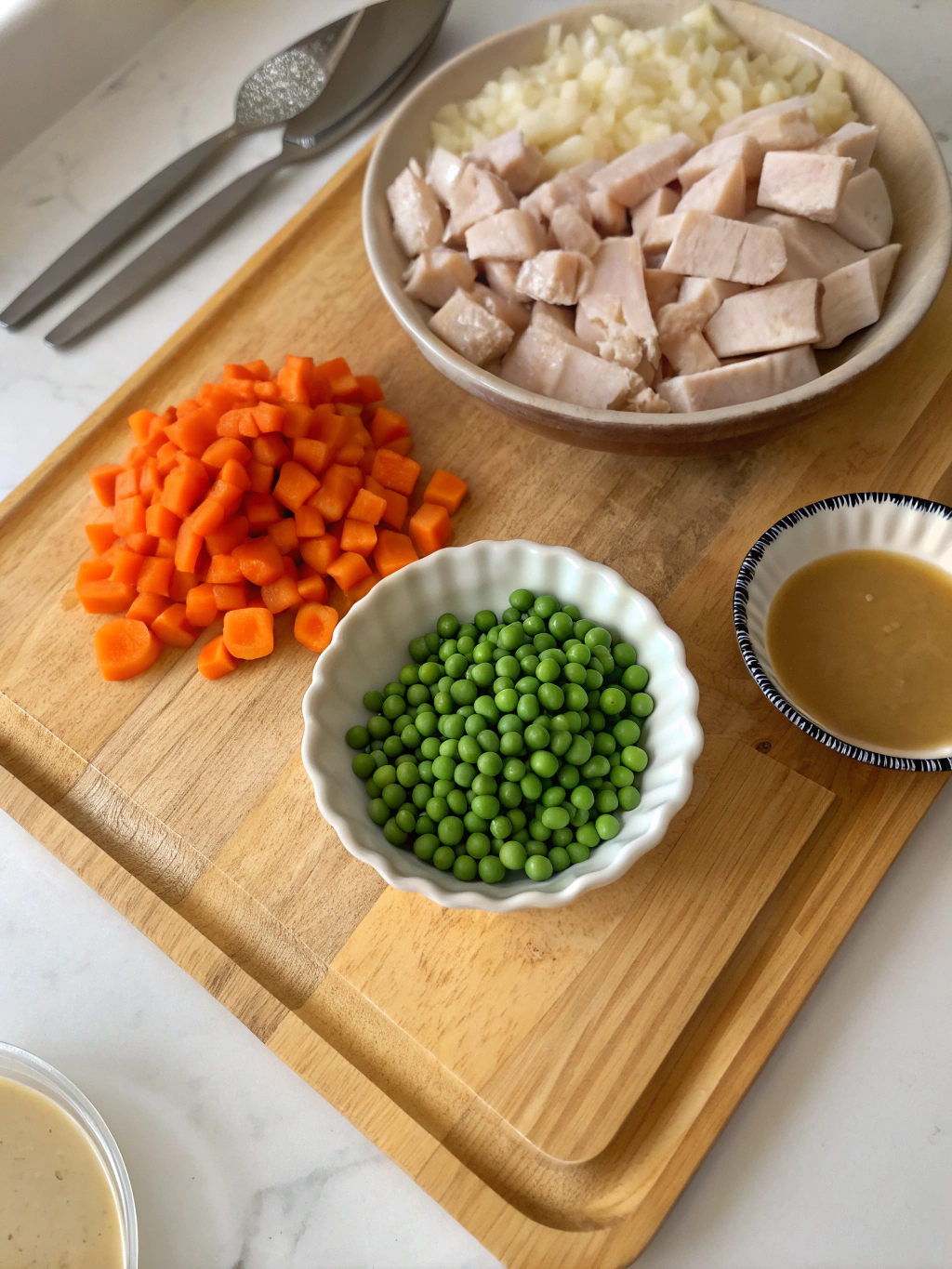 Add your thyme, rosemary, salt, and pepper to the sauce. If using white wine, add it now and let it reduce for 2 minutes. Fold in your shredded turkey, frozen peas and carrots, and diced celery. Simmer gently for 5 minutes, allowing flavors to meld and ingredients to heat through. Taste and adjust seasonings as needed—remember, your filling should be well-seasoned since it’s the heart of this dish.